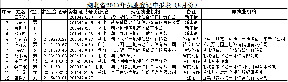 2017年8月土地估价师执业登记申报及转移注销情况公示