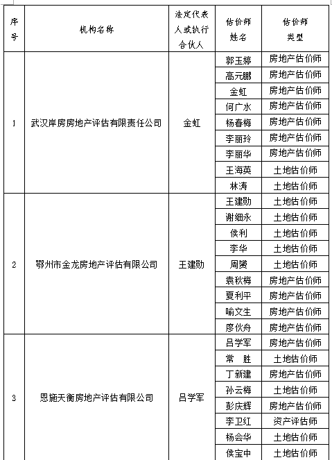 根据《湖北省土地估价与登记代理协会章程》,经机构自愿申请,协会秘书处受理,会员会籍委员会初审,并经书面征求四届二次常务理事会同意,现对符合《湖北省土地估价师协会入会及会员会籍管理办法》条件的3家土地估价机构吸纳入会,现公示如下: