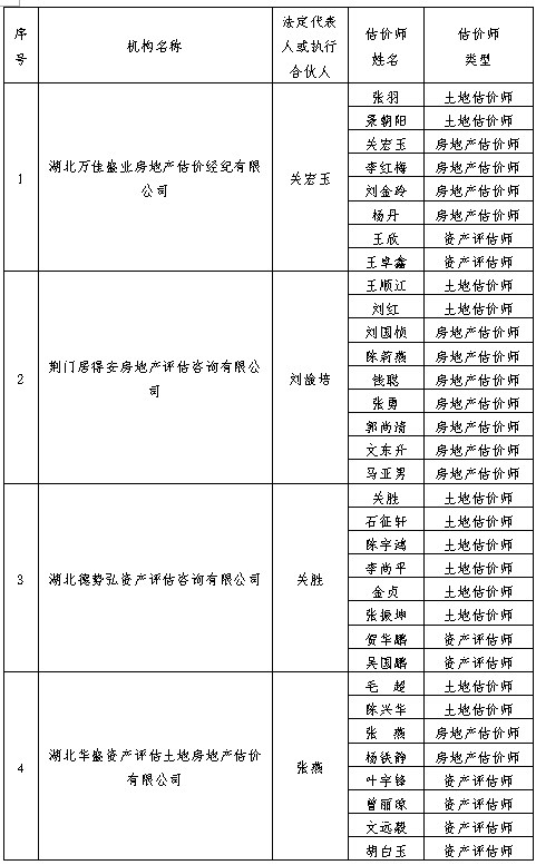 根据《湖北省土地估价与登记代理协会章程》,经机构自愿申请,协会秘书处受理,会员会籍委员会初审,并经书面征求常务理事会同意,现对符合《湖北省土地估价师协会入会及会员会籍管理办法》条件的4家土地估价机构吸纳入会,现公示如下: