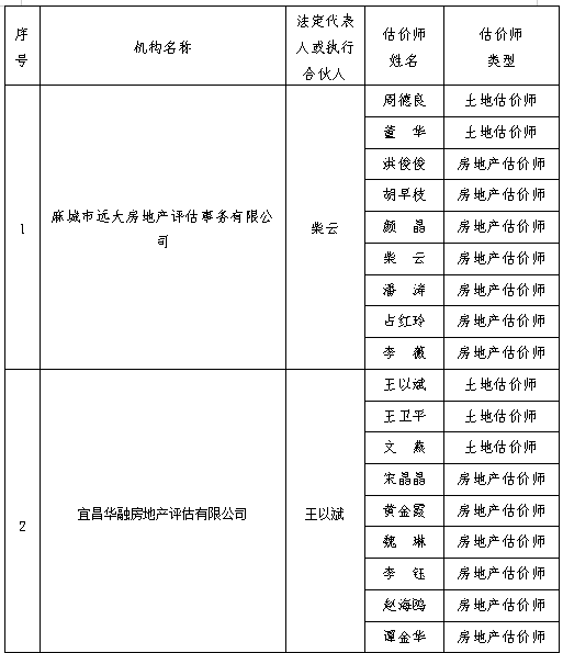 根据《湖北省土地估价与登记代理协会章程》,经机构自愿申请,协会秘书处受理,会员会籍委员会初审,并经书面征求常务理事会同意,现对符合《湖北省土地估价师协会入会及会员会籍管理办法》条件的2家土地估价机构吸纳入会,现公示如下:
