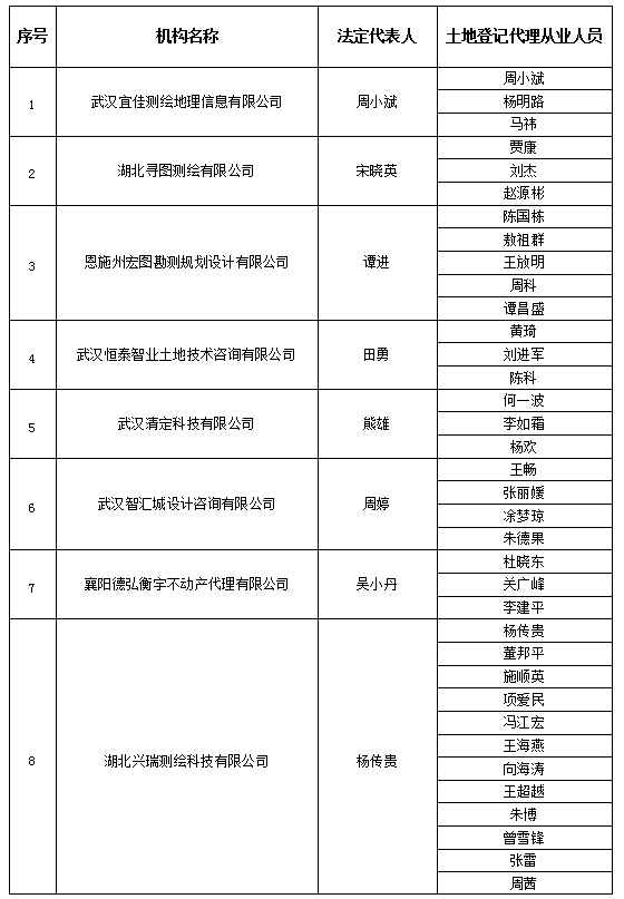 根据《湖北省土地估价与登记代理协会章程》和《湖北省土地(不动产)登记代理中介机构登记服务办法(暂行)》,经机构自愿申请,协会秘书处受理,会员会籍委员会审查,并经书面征求常务理事会同意,拟吸纳如下土地(不动产)登记代理机构入会,现公示如下,如有异议请于一周内联系省协会(027-87830535 邓少蓉)。