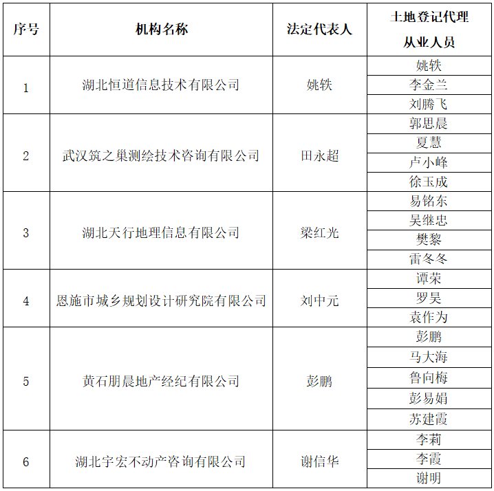 根据《湖北省土地估价与登记代理协会章程》和《湖北省土地(不动产)登记代理中介机构登记服务办法(暂行)》,经机构自愿申请,协会秘书处受理,会员会籍委员会审查,并经书面征求常务理事会同意,拟吸纳如下土地(不动产)登记代理机构入会,现公示如下,如有异议请于一周内联系省协会(027-87830535 邓少蓉)。
